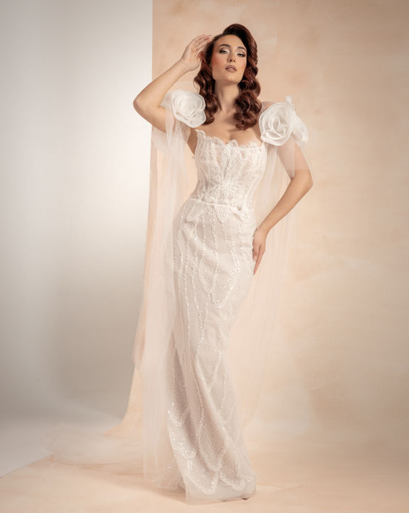 The models in the collection are rich with luxurious embroidery featuring crystals and pearls, and delicately handcrafted 3D flowers. The cuts embrace the body and follow the female silhouette, creating a glamorous look with sculptural beauty.